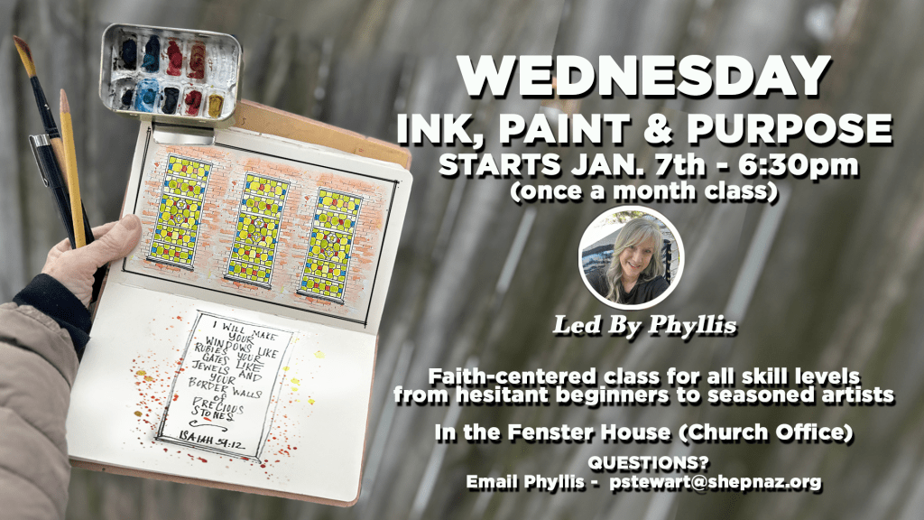A creative, faith-centered art class for all skill levels—from hesitant beginners to seasoned artists. Led by Phyllis and meeting in the Fenster House (church office) on the first Wednesday of each month.