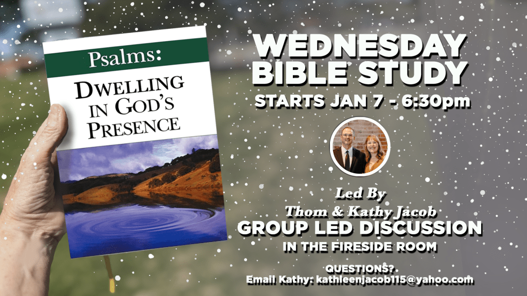 A group-led discussion exploring the Psalms and what it means to live in God’s presence. Led by Thom and Kathy Jacob in the Fireside Room.